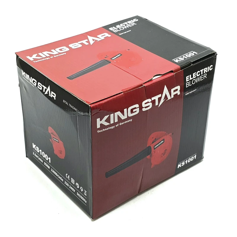 مشخصات دستگاه دمنده و مکنده برقی کینگ استار: حجم هوای خروجی:۲.۵ متر مکعب بر دقیقه قدرت:۹۵۰ وات سرعت چرخش:۱۳۶۰۰ دور در دقیقه برق مصرفی:۲۲۰ تا ۲۴۰ ولت