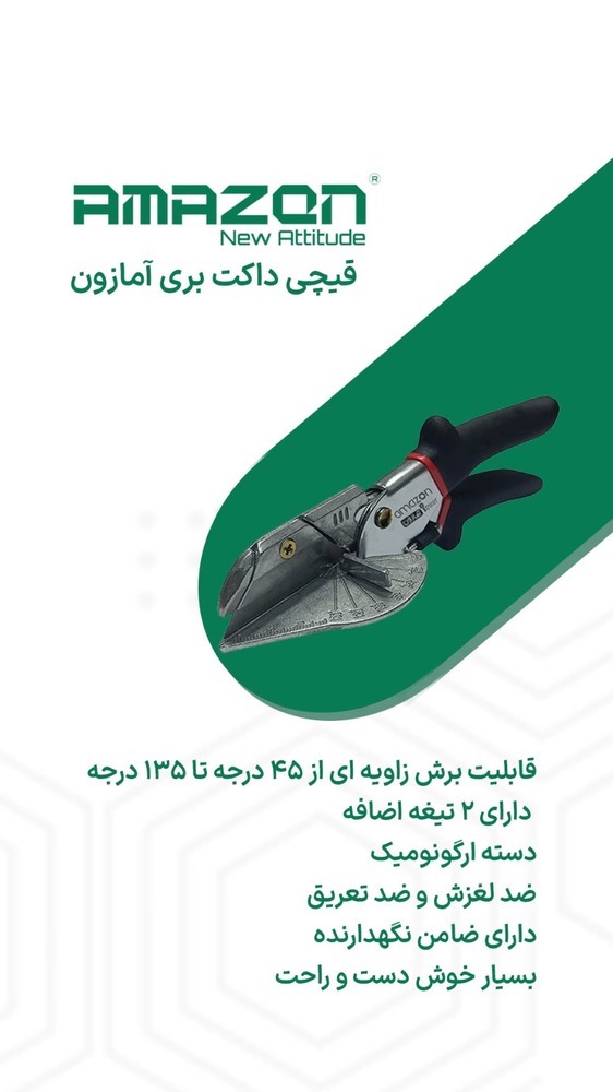 قیچی داکت بری زاويه زن آمازون، یک ابزار کاربردی برای برش دقيق، سریع و راحت انواع داکت های پی وی سی است. نقاله مدرج ضامن دار اين ابزار، امکان تنظيم سريع زاويه برش را فراهم می آورد. در صورت کند شدن يا آسیب ديدن تيغه، می توان به راحتی آن را با تيغه های یدک موجود در بسته بندی کالا جايگزين کرد. اين ابزار، به ويژه برای تکنسين های نصب دوربين های مداربسته، تکنسين های نصب تاسیسات الکتريکی، برق صنعتی و سیم کشی ساختمان کاربرد دارد. علاوه بر آن در ساير مشاغل و فعاليت هایی که با برش مصنوعات غيرفلزی سر و کار دارند (مثل صنايع دستی)، می تواند باعث افزايش کيفيت و سرعت توليد باشد. قيچی زاويه زن آمازون می تواند در ساخت کاردستی (با رعایت ایمنی) برای رشد خلاقيت و توانمندی نوجوانان و دانش آموزان کارآمد باشد.