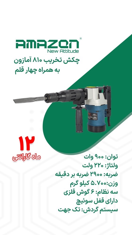 چکش تخریب آمازون مدل 0810T انتخاب ایدهآل برای پروژههای سنگین و حرفهای است. با قدرت تخریب بینظیر، طراحی ارگونومیک و موتور پرقدرت، هر سطحی را بهراحتی و با سرعت تخریب کنید. با خرید این ابزار، بهرهوری و کارایی خود را به حداکثر برسانید. همین حالا سفارش دهید و تخریب را آسان کنید!چکش تخریب آمازون مدل 0810T یکی از ابزارهای پرقدرت و حرفهای برای تخریب بتن، سنگ، دیوار آجری و کاشی است. این دستگاه با موتور 900 وات و نیروی ضربه 15 ژول، مناسب پروژههای سنگین ساختمانی و عمرانی میباشد.طراحی ارگونومیک دسته جانبی و موتور 100٪ مسی، راحتی و طول عمر بالای دستگاه را تضمین میکند. همراه با چکش تخت و نوکتیز و کیف حمل مقاوم، این محصول یک گزینه کامل برای استفاده حرفهای و خانگی است.