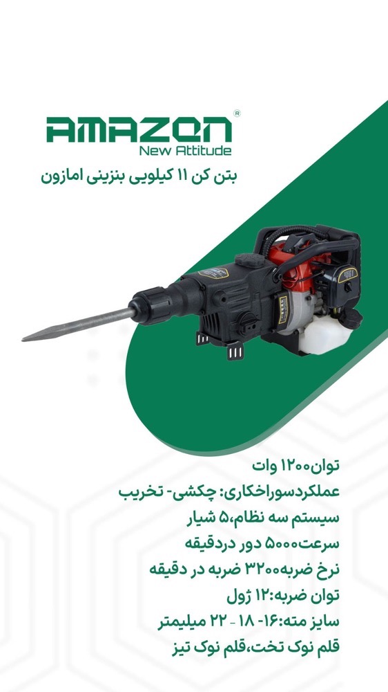 بتن کن دو کاره بنزینی آمازون مدل GH2F، انتخابی بینظیر برای پروژههای ساخت و ساز حرفهای! با قدرت موتور بالا و طراحی ارگونومیک، این دستگاه به شما اجازه میدهد به راحتی و با دقت بالا بتن را تخریب یا سوراخ کنید. سرعت و کارایی چشمگیر، کار سخت را آسان میکند. این محصول دارای 1200 وات توان هستش سرعت آن 5000 دور دردقیقه هست و همچنین دارای سیستم سه نظام 5 شیار هست. همین حالا اقدام کنید و بهرهوری خود را افزایش دهید!